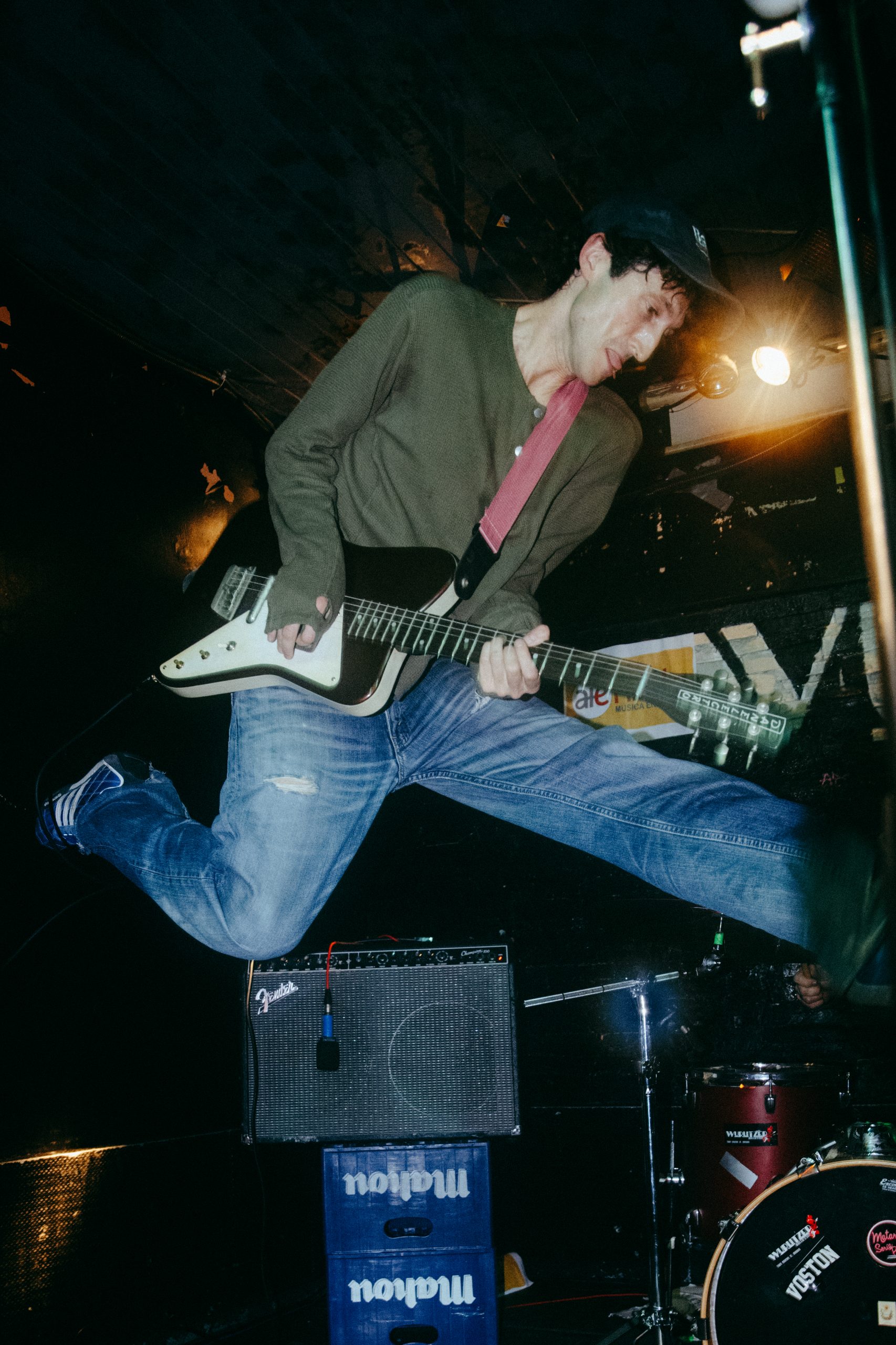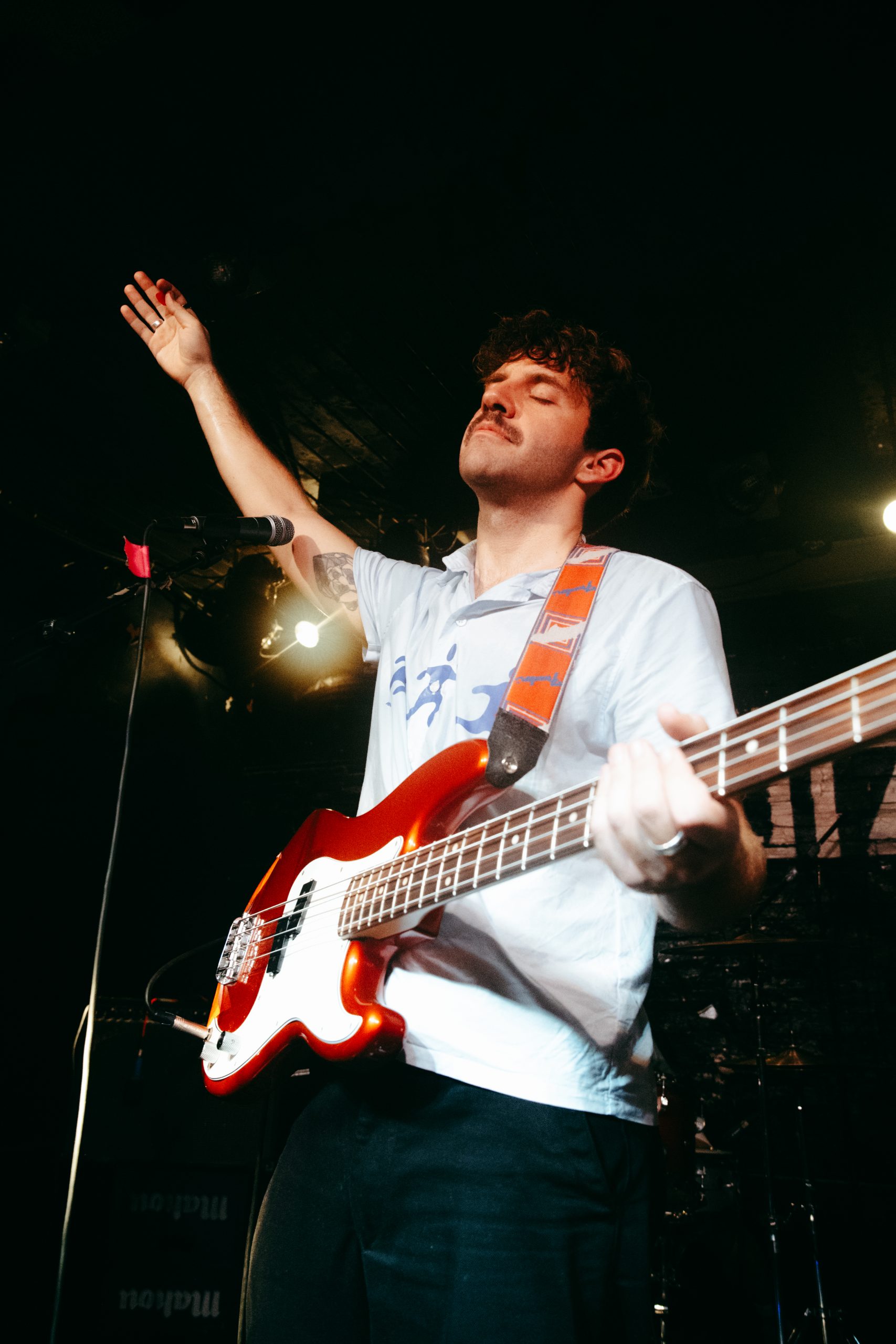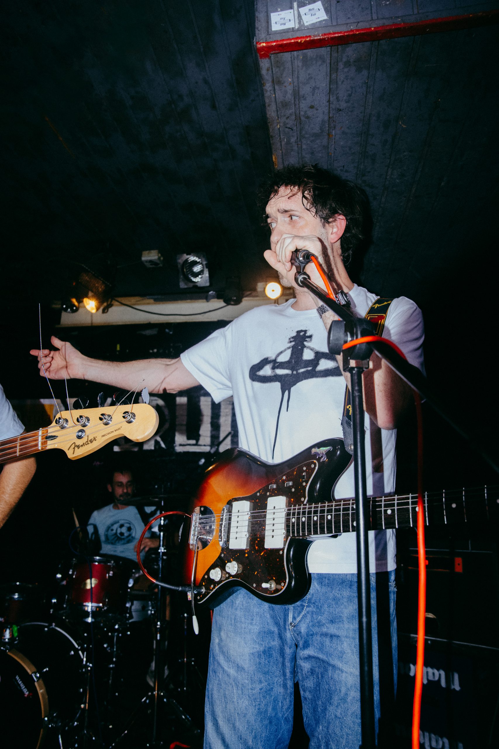 De cara a ‘Teleoperador‘ y ‘Persona Deconstruida‘, Dani realizó su show habitual en el que se despoja de su instrumento, el bajo, para lanzarse a bailar entre el público e interactuar con todos ellos en lo que resulta una auténtica performance de lo más divertida, que acompaña sin duda el tono satírico de ambas canciones. Además, para esta ocasión contamos con Rita, bajista del otro grupo del frontman de Alavedra, Niños Bravos, que tomó el bajo de Dani para tocar en su lugar — una situación que declararon varias veces no estaba para nada planeada, y Rita se estaba aprendiendo los temas sobre la marcha.