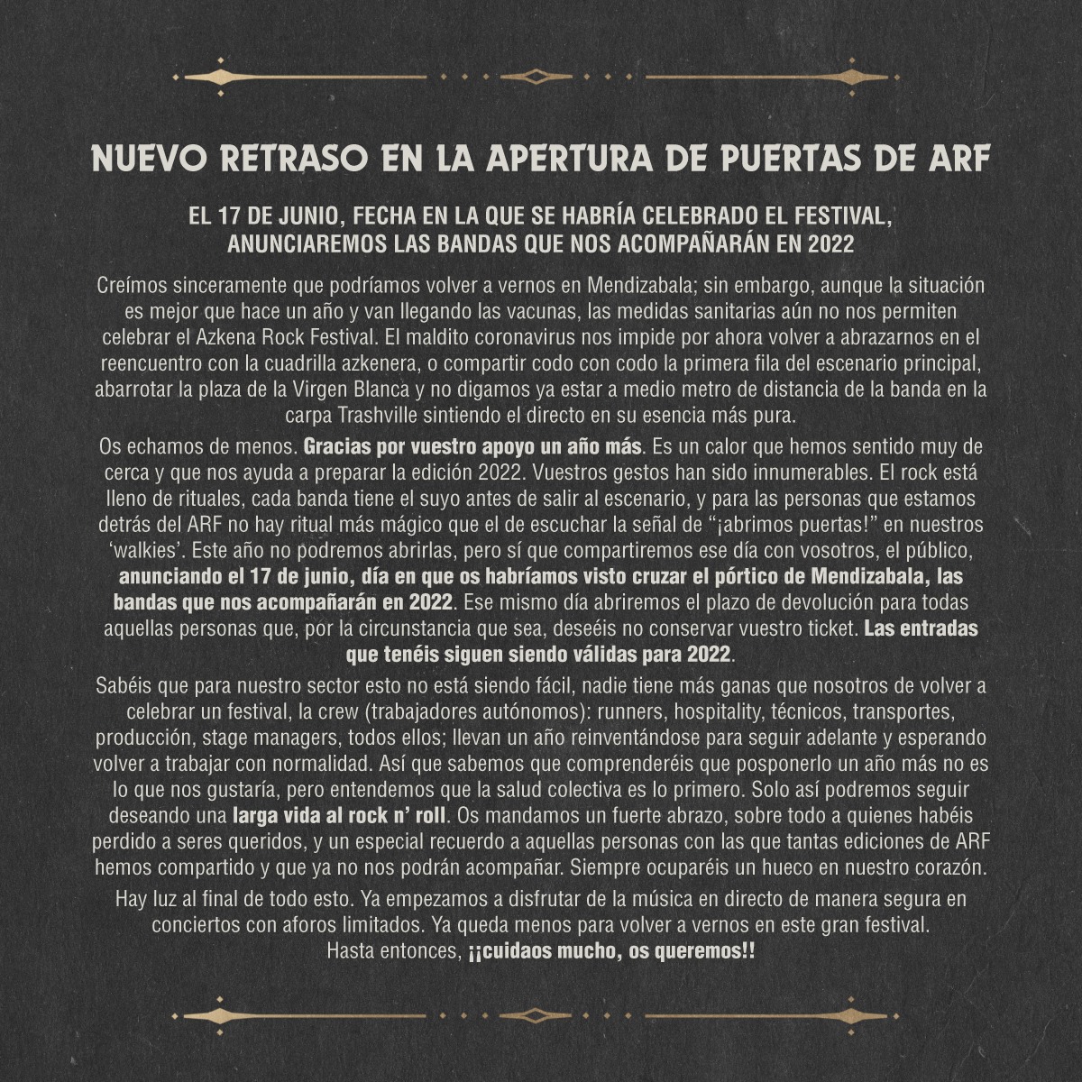 Al respecto de esta noticia el Azkena ha emitido un extenso comunicado explicando que, aunque la situación sanitaria respecto al coronavirus se encuentra mejor que hace un año, todavía es imposible hacer el festival. En él no confirman la fecha en la que se realizará en 2022, pero sin embargo sí informan que el próximo jueves 17 de junio, día en el que iba a comenzar la edición de este año en Mendizabala, anunciarán las bandas que serán parte del festival en 2022.