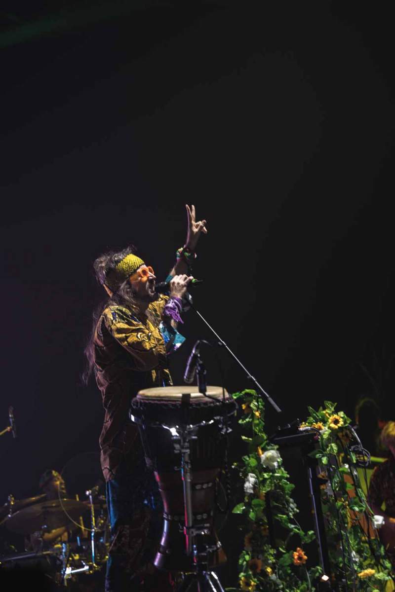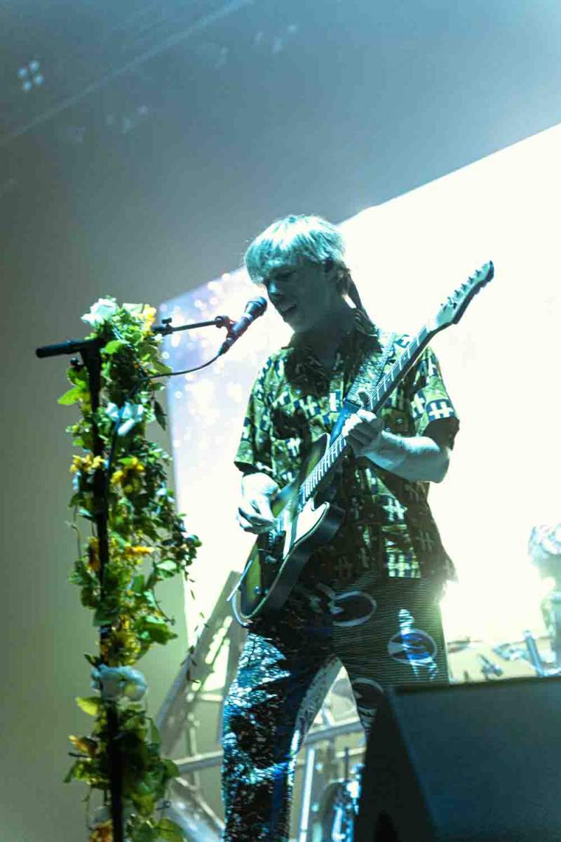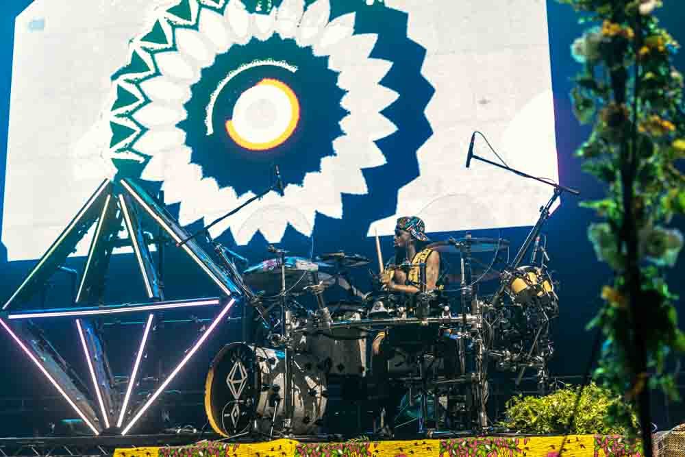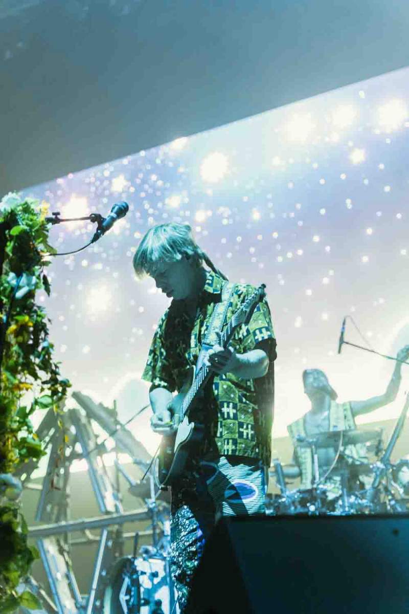 La versatilidad de los músicos fue otro de los puntos fuertes del espectáculo. Ninguno se limitó a un solo instrumento, y esa flexibilidad y movimiento continuo se reflejaron en la energía del show. Jason Condison, el baterista, mostró una increíble destreza y fue clave para mantener la intensidad de la noche, especialmente durante las canciones más movidas. Drew Wynen, el guitarrista, aportó riffs electrizantes que añadieron una capa extra de energía a cada tema, demostrando su talento y conexión con el resto del grupo. Especialmente destacable fue el momento en el que tras hacer que el concierto “se terminaba” y volver a entrar a tocar los últimos temas, Gilbert Vierich, uno de los fundadores de la banda, se sentó a tocar la batería mientras Jason se convertía en el animador de la noche, dirigiendo al público con una energía contagiosa. Esta dinámica sorpresa dejó claro que, para Crystal Fighters, el escenario es un lugar de libertad y expresión, donde todo puede suceder.