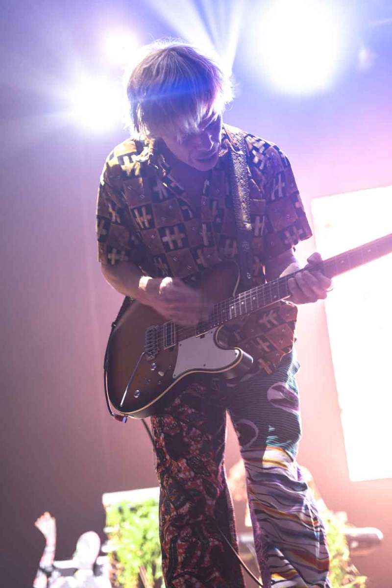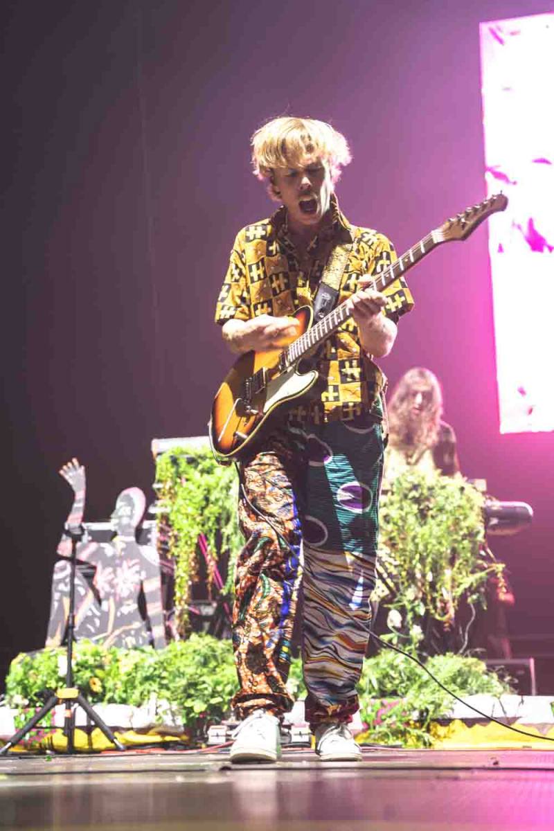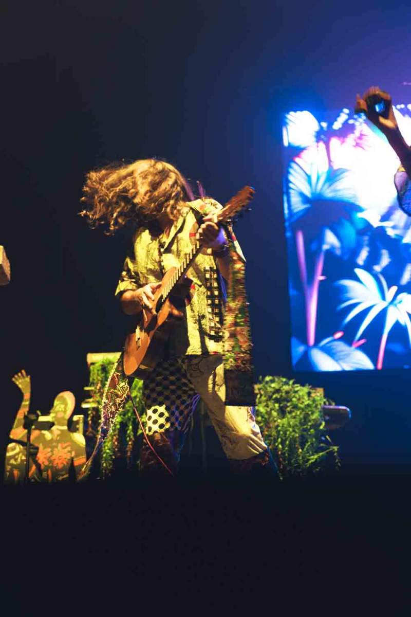 La versatilidad de los músicos fue otro de los puntos fuertes del espectáculo. Ninguno se limitó a un solo instrumento, y esa flexibilidad y movimiento continuo se reflejaron en la energía del show. Jason Condison, el baterista, mostró una increíble destreza y fue clave para mantener la intensidad de la noche, especialmente durante las canciones más movidas. Drew Wynen, el guitarrista, aportó riffs electrizantes que añadieron una capa extra de energía a cada tema, demostrando su talento y conexión con el resto del grupo. Especialmente destacable fue el momento en el que tras hacer que el concierto “se terminaba” y volver a entrar a tocar los últimos temas, Gilbert Vierich, uno de los fundadores de la banda, se sentó a tocar la batería mientras Jason se convertía en el animador de la noche, dirigiendo al público con una energía contagiosa. Esta dinámica sorpresa dejó claro que, para Crystal Fighters, el escenario es un lugar de libertad y expresión, donde todo puede suceder.