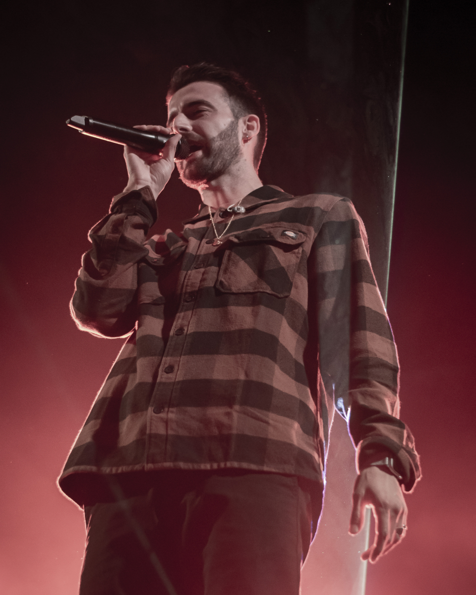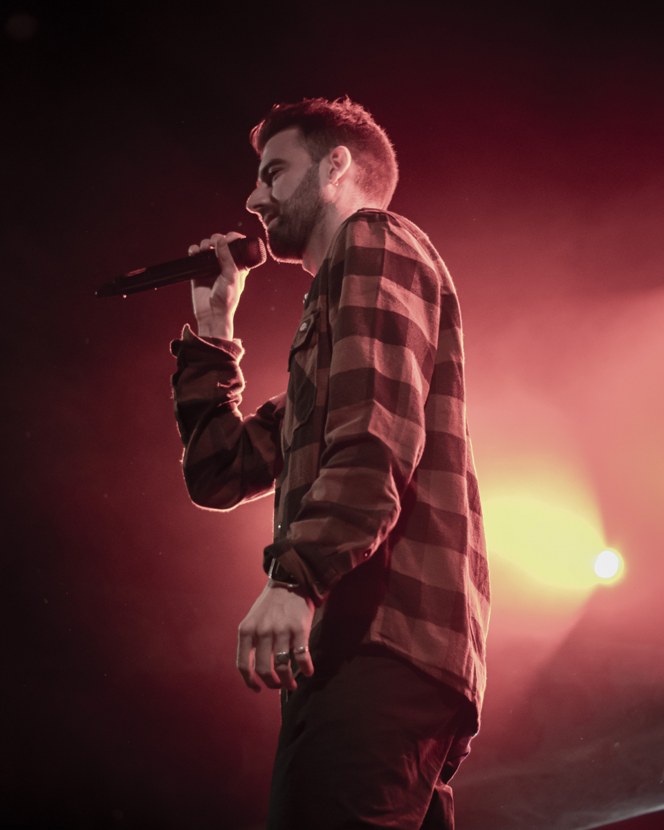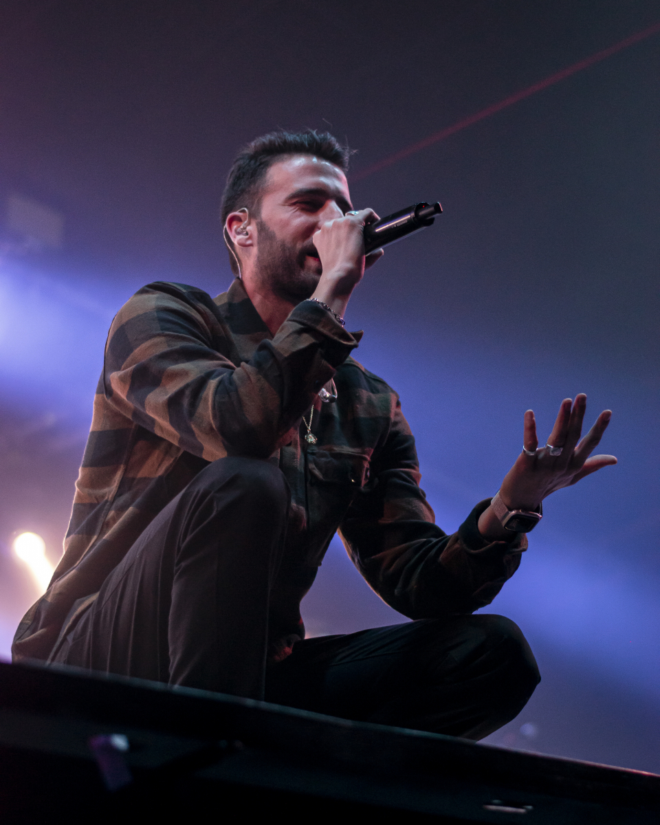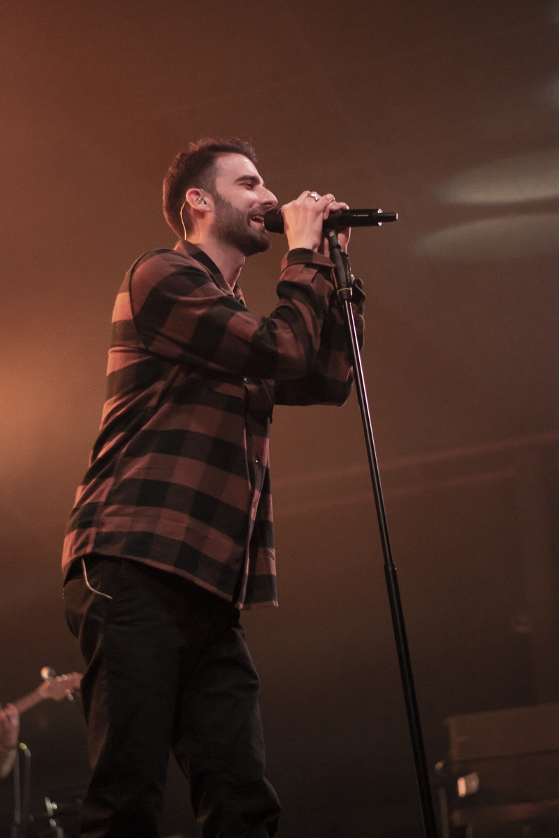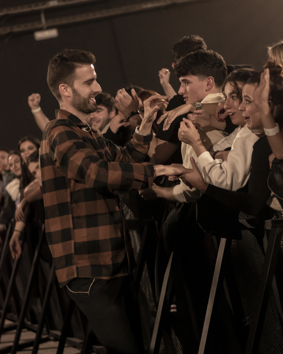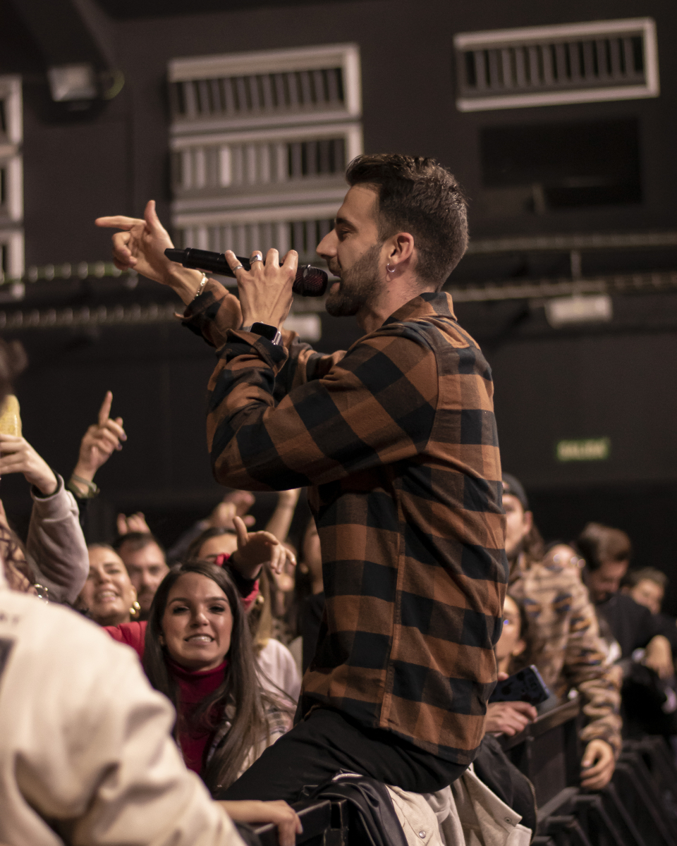 Se escucha ‘Aire’, el décimo tema del disco. El espacio se llena de luces que pintan de azul al artista y a toda su banda tras él. El artista sevillano toca un teclado al mismo tiempo que usa su voz para interpretar la obra. Luego, con ‘Tú qué ves en mí’, no puede borrar lo que está escrito, pero sí que puede invitar al público a dar besos y abrazos a la persona con la que han venido. Desde la primera fila se percibe el cariño que se dan dos grupos de amigas y algunas parejas.
