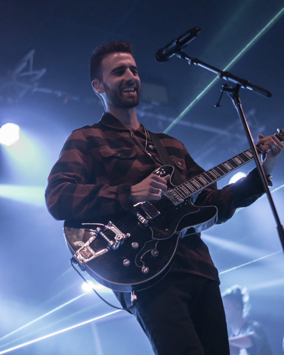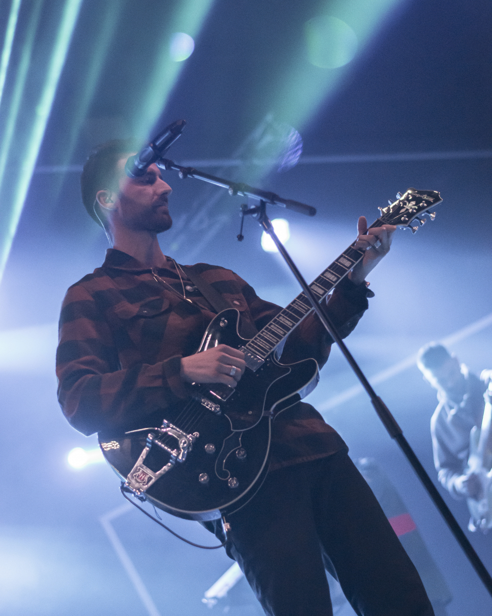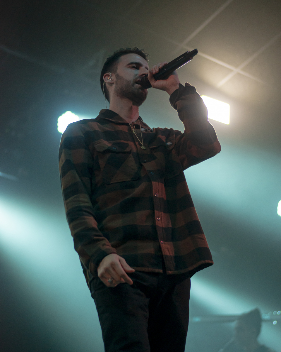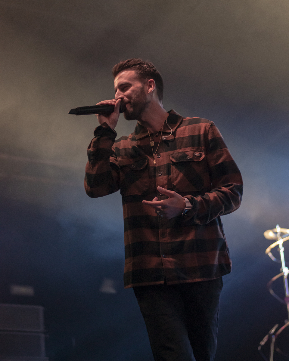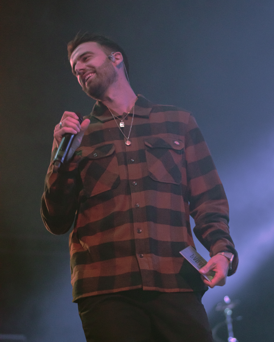 Se escucha ‘Aire’, el décimo tema del disco. El espacio se llena de luces que pintan de azul al artista y a toda su banda tras él. El artista sevillano toca un teclado al mismo tiempo que usa su voz para interpretar la obra. Luego, con ‘Tú qué ves en mí’, no puede borrar lo que está escrito, pero sí que puede invitar al público a dar besos y abrazos a la persona con la que han venido. Desde la primera fila se percibe el cariño que se dan dos grupos de amigas y algunas parejas.